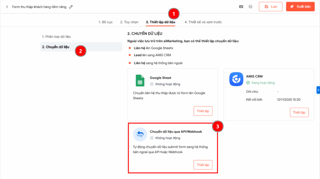 Tính năng Chuyển dữ liệu qua API/Webhook cho phép người dùng tự động gửi các lượt submit form thu thập từ aiMarketing sang hệ thống bên ngoài (như CRM, hệ thống chăm sóc khách hàng v.v) thông qua API hoặc Webhook do đối tác cung cấp.