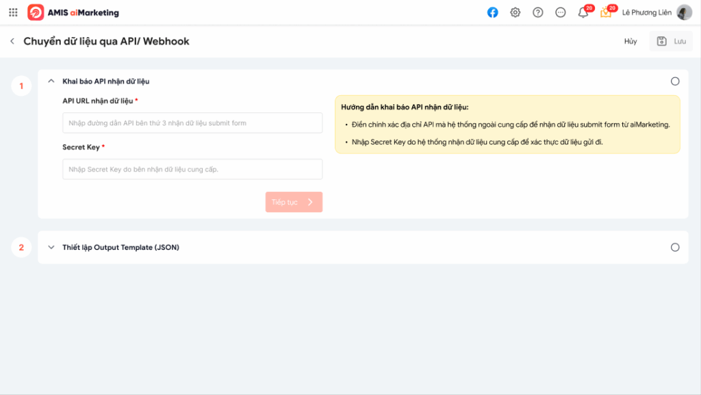 - API URL nhận dữ liệu: Nhập chính xác địa chỉ API mà hệ thống ngoài cung cấp để nhận dữ liệu từ aiMarketing. Ví dụ: https://api.tencongty.com/v1/lead/receive